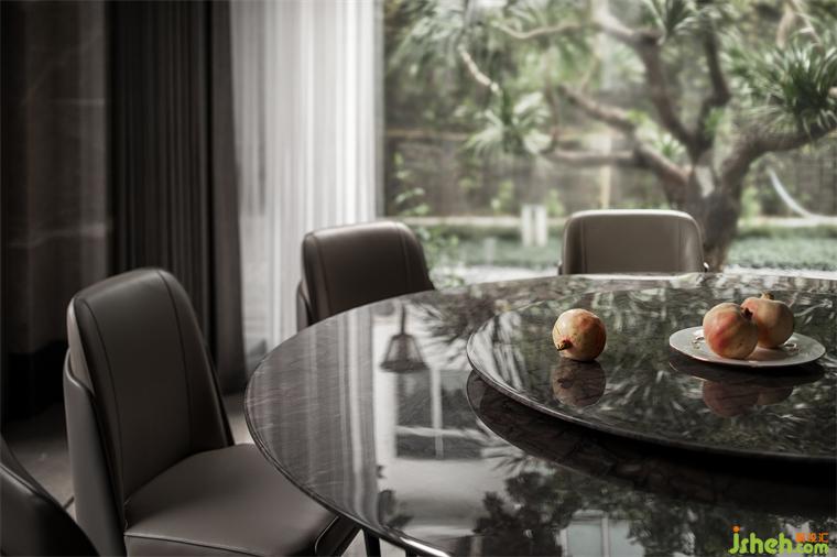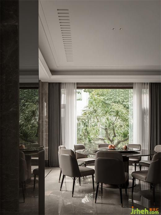 一層中餐廳靜享庭院的自然風(fēng)光,視野開闊,大理石圓桌與啞灰色餐椅的軟飾搭配與光影互補(bǔ)共生。