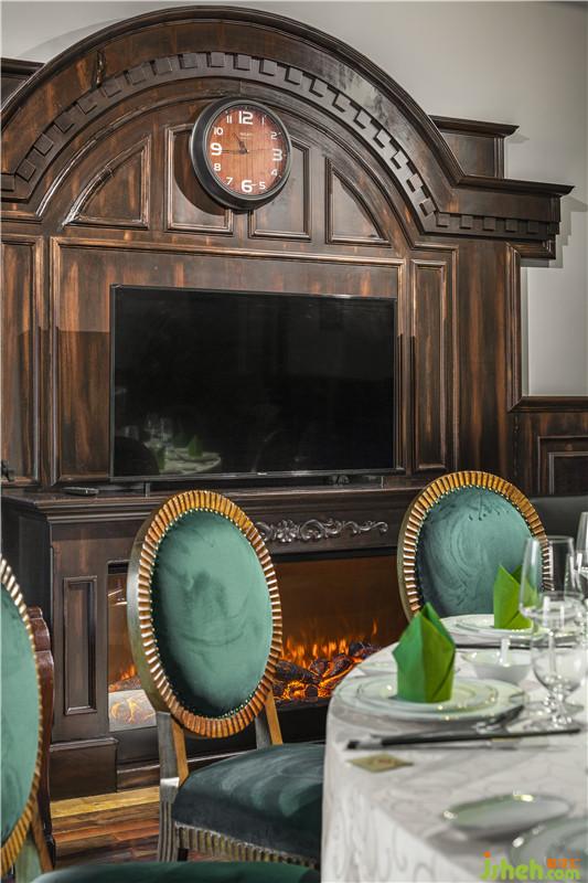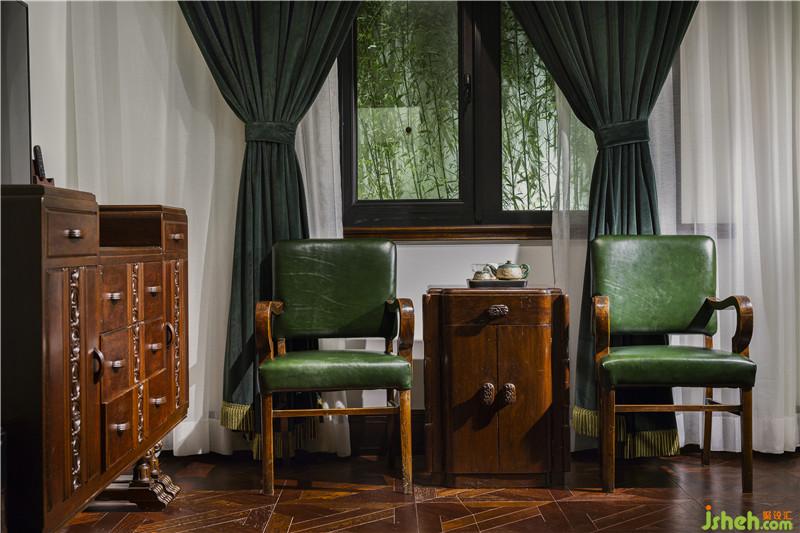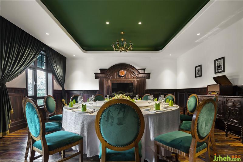 孔雀綠色的窗簾似于綠色的椅子相呼應(yīng),對(duì)稱的窗格花紋,將用餐的儀式感烘托而出。