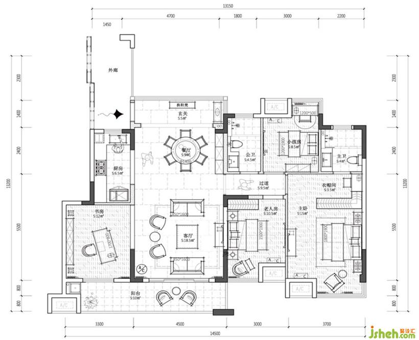項(xiàng)目面積:戶型121.5㎡