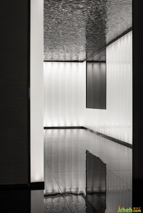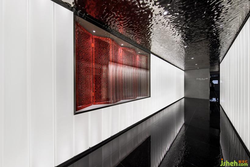 U型玻璃是一款新型的可發(fā)光材料,用于構(gòu)建整個(gè)入口處的光廊;黑金沙地磚深邃神秘,鋪設(shè)整個(gè)地面作為托底;金屬波紋板天花,詮釋了深圳前海特殊片區(qū)的的海洋靈動,同時(shí)彌補(bǔ)了層高不足的壓迫感。