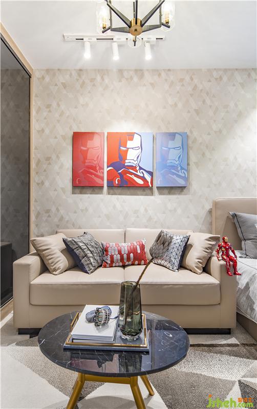 空間中提取鋼鐵俠作為元素幾何圖案和線條貫穿其中更為空間增添了幾分硬朗的氣質。和整體空間形成對話和互動。樣板房設計