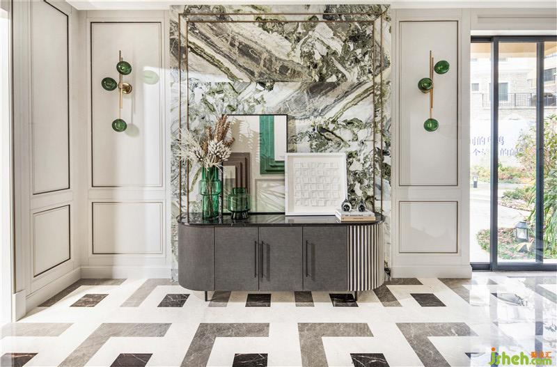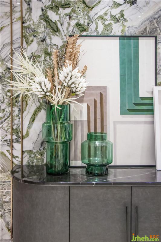 高級而富有質(zhì)感的大理石紋作為背景,幾何立體裝飾畫搭配出豐富層次并且多樣的質(zhì)感。樣板房設計