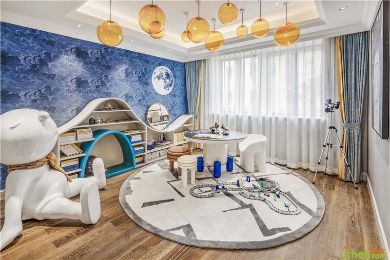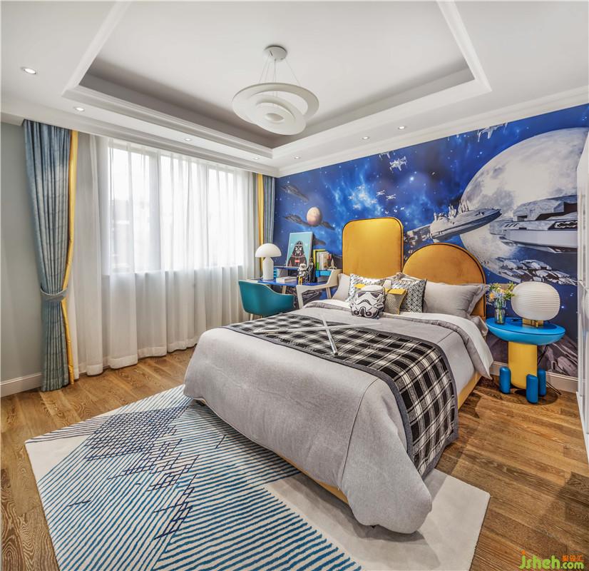 相較于其他空間,兒童房的設(shè)計(jì)充滿了活力與想象,外太空壁紙掛滿整個(gè)墻面,與各種科幻元素的結(jié)合,讓孩子沉浸在自由想象的世界當(dāng)中。