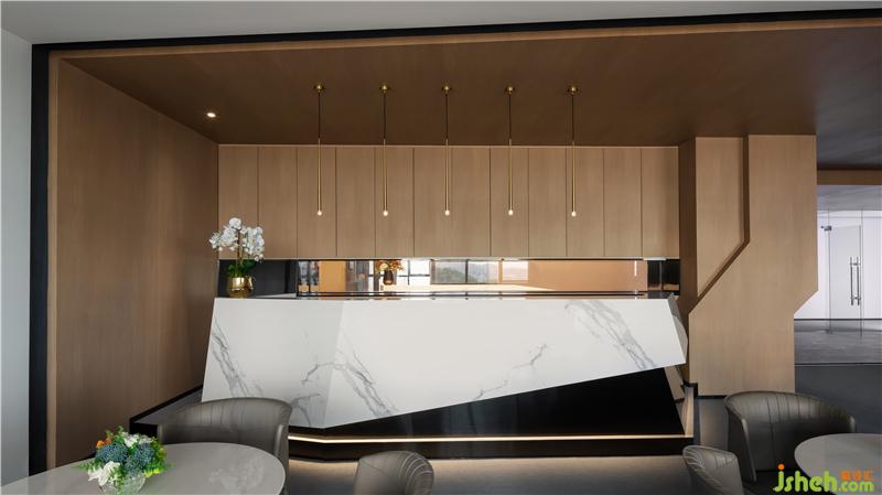 由入口進入室內(nèi),售樓處設(shè)計采用山水紋理的大理石的接待臺便映入眼前,傳達氤氳的氣息,使接待中心各個空間流暢而富有變化,與線條型的燈光樣條遠近呼應,營造出包容氣質(zhì),似乎也 在隱隱的傳達這座城市的容貌,慢慢的深入,漸漸展露它的真實面容。