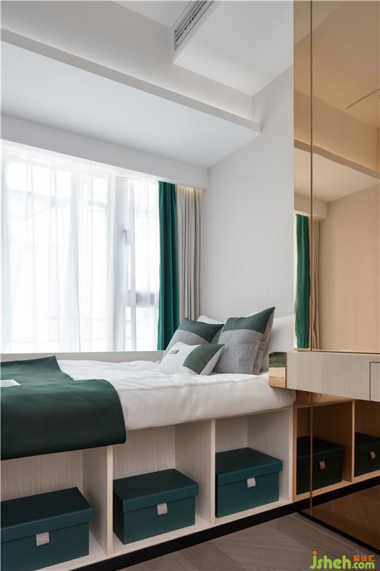 客房利用了和主臥異曲同工的設(shè)計(jì)手法,樣板房設(shè)計(jì)讓原本壓迫空間的飄窗成為了床的一部分,而床下則被改造成了規(guī)整的收納空間。床、飄窗、和收納空間三者合一的設(shè)計(jì)手法,讓空間整體的宜居性,有了更進(jìn)一步的提升;