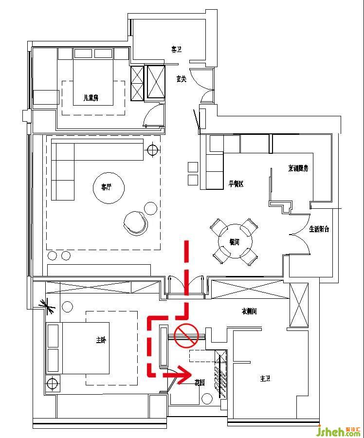 4. 主臥內(nèi)私密性較低,房主安全感。隨后依據(jù)以上問(wèn)題進(jìn)行再規(guī)劃設(shè)計(jì)