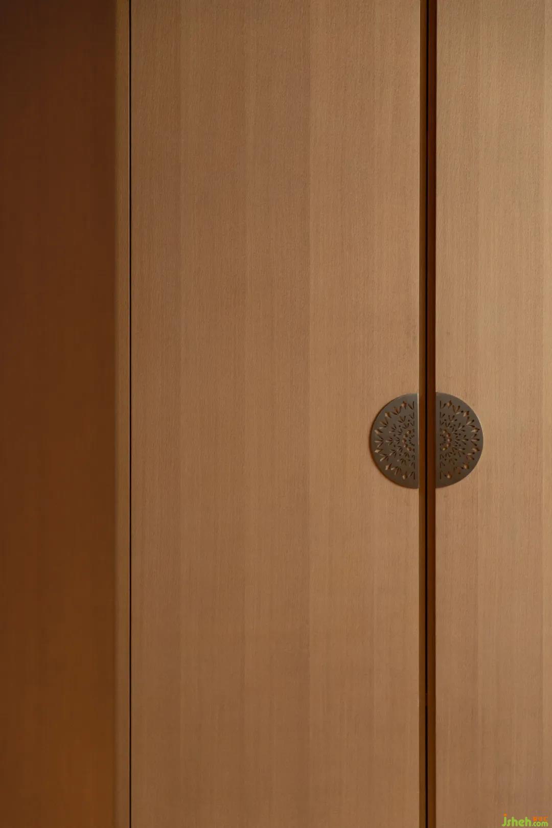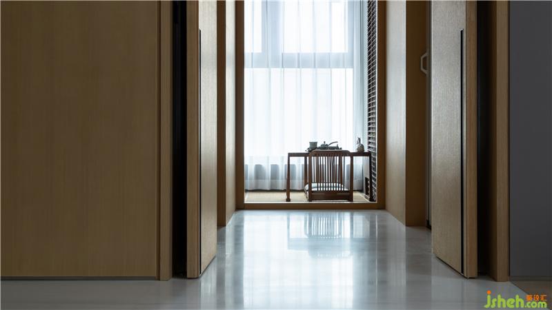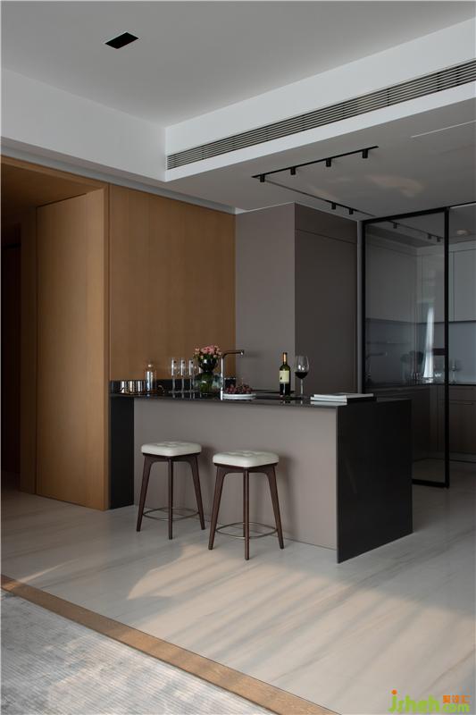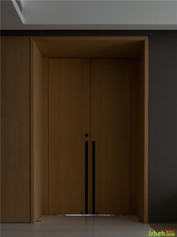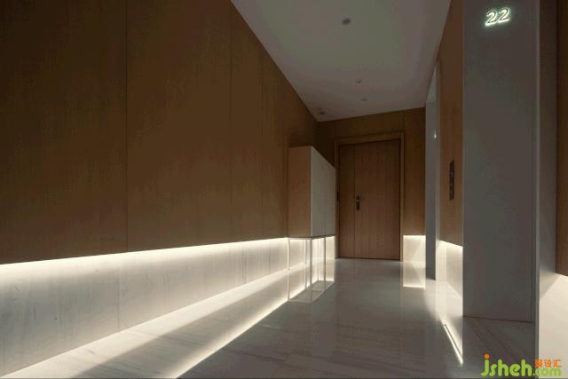 在入門處,從電梯廳走出,可發(fā)現(xiàn)鞋架與空間渾然一體,豪宅設(shè)計(jì)師特意地將鞋架抬高,便于房主進(jìn)出門脫換。人為地將鞋柜木飾面與墻面統(tǒng)一,簡(jiǎn)雅而不失格調(diào)。