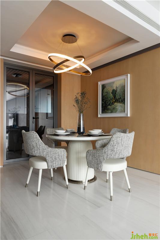 餐廳作為家庭情感交流的重要場(chǎng)地,減去了繁復(fù)的裝飾,天然木材和白色大理石圓臺(tái)桌營(yíng)造出融洽舒適的生活意向。在就餐的同時(shí)也構(gòu)建起了人們的各種想象,提升了生活情調(diào)。