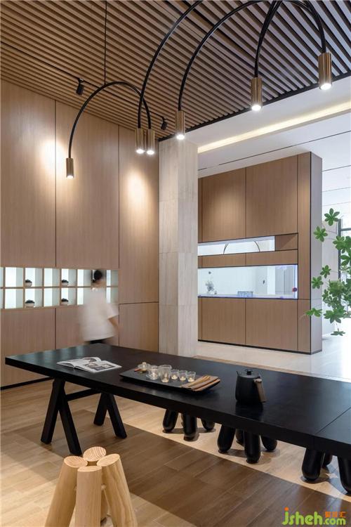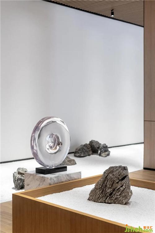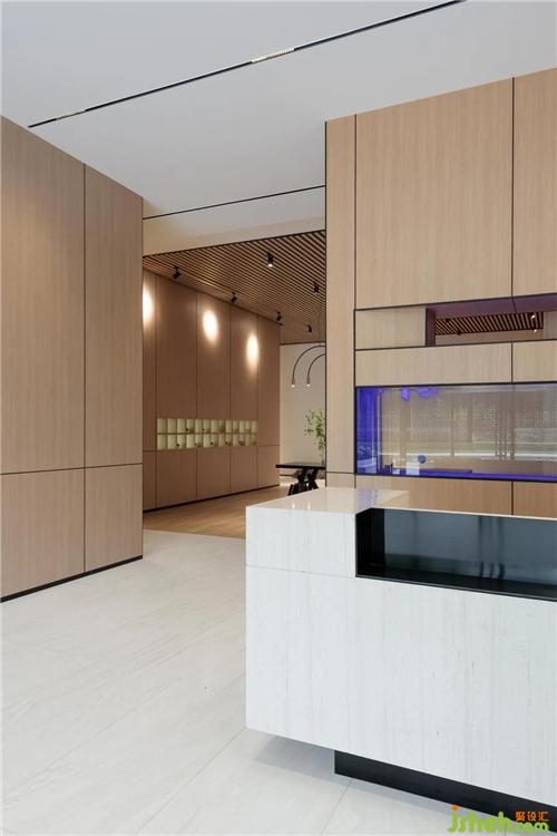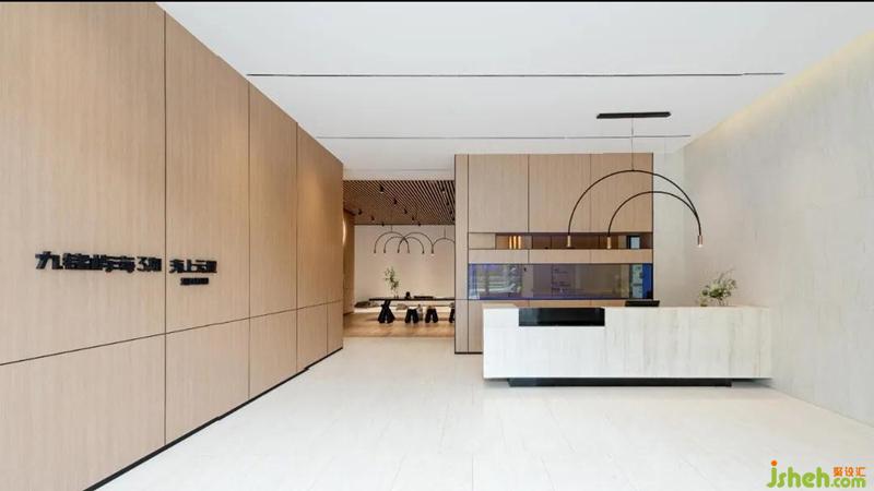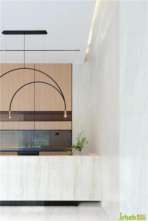 “嶼·見”,從主題中的“見”字提取元素,煉化成拱門的形狀,融入作品中。好比接待大堂入門便見拱形元素的前臺吊燈。