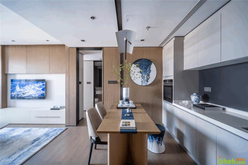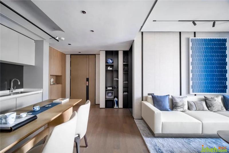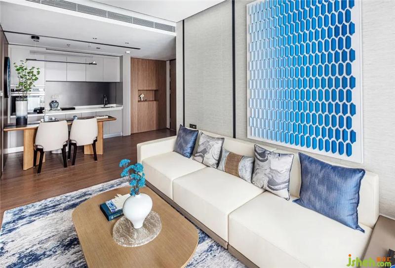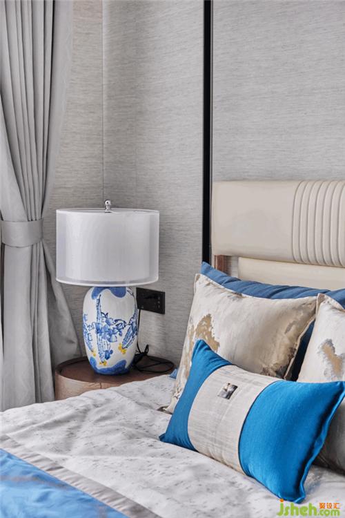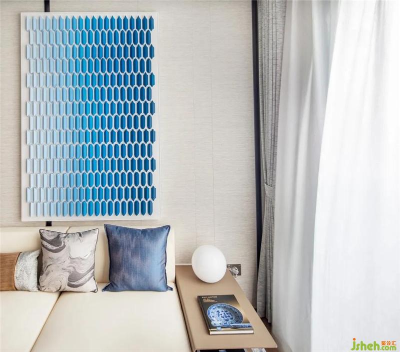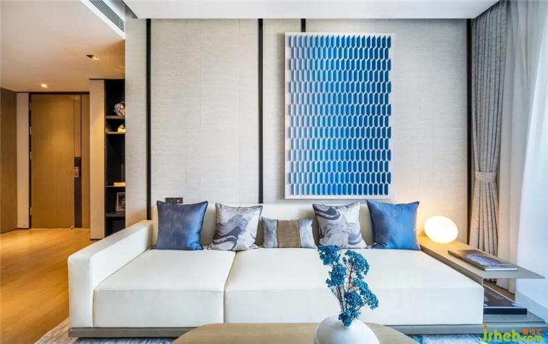 以民族特色的青花圖案表現(xiàn),讓整個(gè)空間傳統(tǒng)中透著現(xiàn)代,現(xiàn)代中揉著古典樣板房設(shè)計(jì)??蛷d白色是整個(gè)房間的主體色,藍(lán)色鋪墊,營造出一派清秀雋永的青花留白之美。