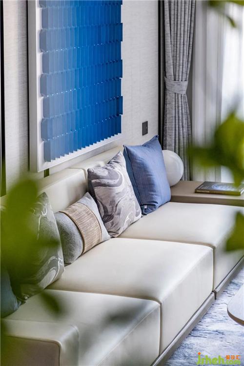 客廳堅(jiān)持以傳統(tǒng)印染工藝的同時(shí)吸納外界各種藝術(shù)形態(tài)帶來的靈感,將漸變的陶瓷片形成天空暈染的藝術(shù)品。在中國傳統(tǒng)色彩中提取詩意的花青色作為裝飾色,提取吉金色作為點(diǎn)綴, 并平衡空間中的色彩分布。