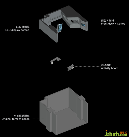 空間原始場(chǎng)地位于來(lái)福士商場(chǎng)主動(dòng)線位置,和場(chǎng)地形成矩形看面。基于重慶經(jīng)緯縱橫的立體城市結(jié)構(gòu)與空間的新商業(yè)需求,展廳設(shè)計(jì)師意圖打造一個(gè)富于吸引力的場(chǎng)景化空間,在CBD高速翻轉(zhuǎn)的場(chǎng)景里營(yíng)造一個(gè)多維舞臺(tái),金屬鈦的前世今生在這里拉開(kāi)大幕。