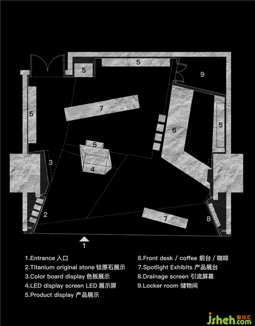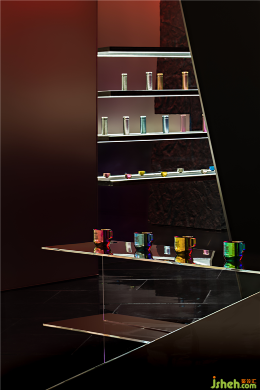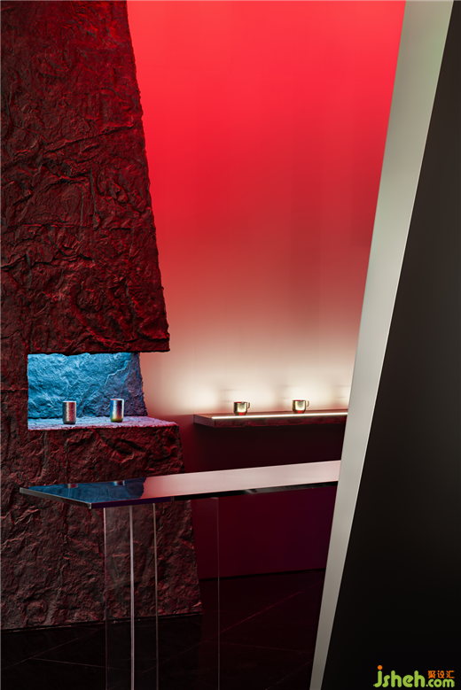 燈光渲染下,絢麗光潔的鈦杯陳列在礦洞石壁上,如同開采后裸露的鈦礦。展廳設(shè)計(jì)空間賦予藝術(shù)潛能和商業(yè)邏輯,而鈦金屬本身的礦物屬性又再次鞏固了這一設(shè)計(jì)敘事,消費(fèi)者進(jìn)入后便成為探洞者,探索和游逛結(jié)合,完成一次由城市進(jìn)入自然,由現(xiàn)代回望遠(yuǎn)古的非凡體驗(yàn)。