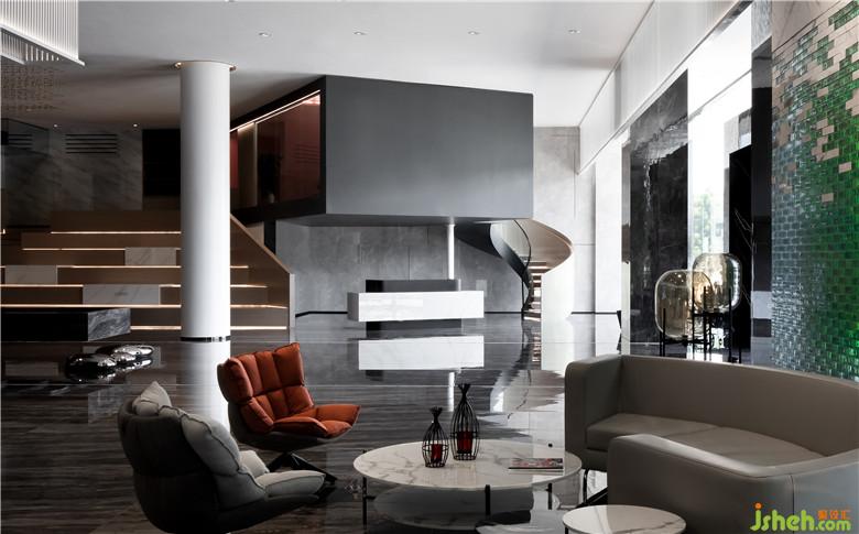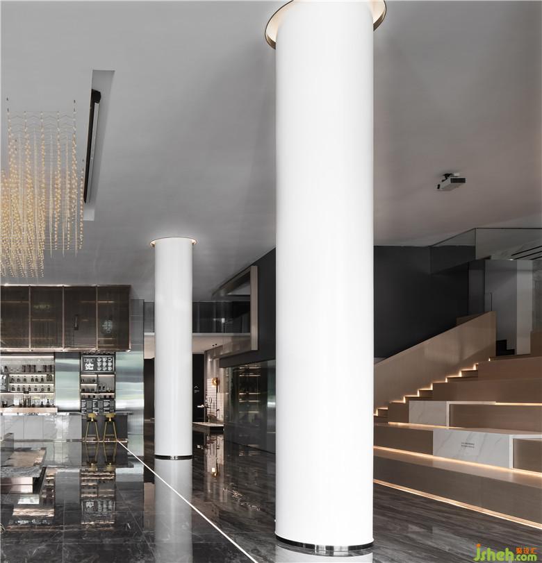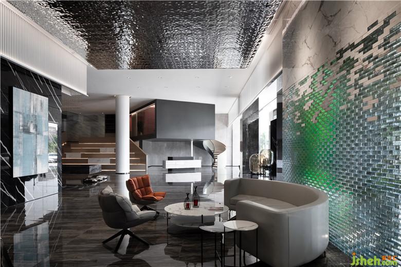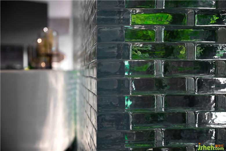 設(shè)計(jì)師通過(guò)使用特殊材質(zhì)來(lái)延續(xù)建筑設(shè)計(jì)的特征,為了阻擋西邊太陽(yáng)的直射,運(yùn)用晶瑩剔透水晶磚和白色大理石磚交混在一起形成一道天然屏風(fēng)。