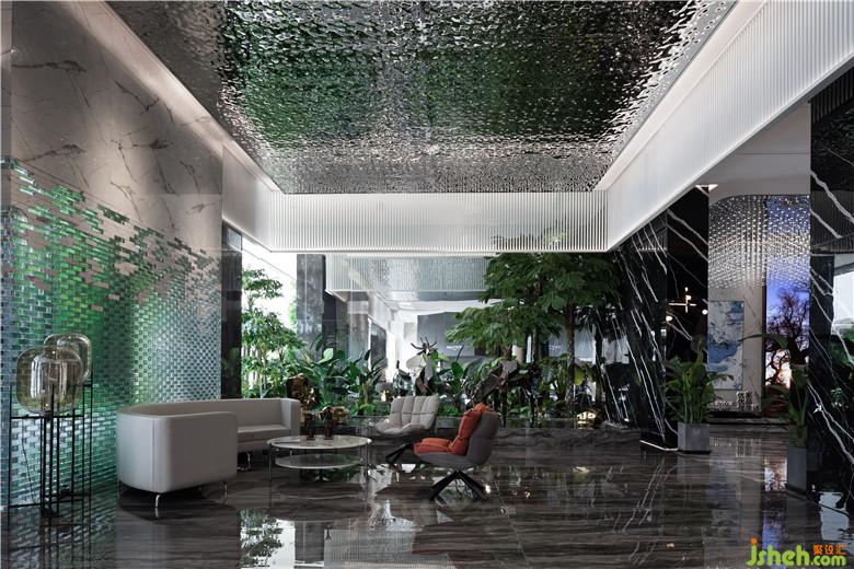 “陽(yáng)光透過(guò)林蔭灑在水面上,麋鹿悠閑的漫步……”在大堂休閑空間中使用浪漫主義手段來(lái)呈現(xiàn)一種天然氧吧氛圍。大片的綠植及用水紋不銹鋼營(yíng)造的水面,通過(guò)鏡面反射將樹(shù)叢變得更有縱深感,曠達(dá)與細(xì)膩碰撞交映,舒展奇妙的流動(dòng)氛圍,人類與大自然共存的和諧。