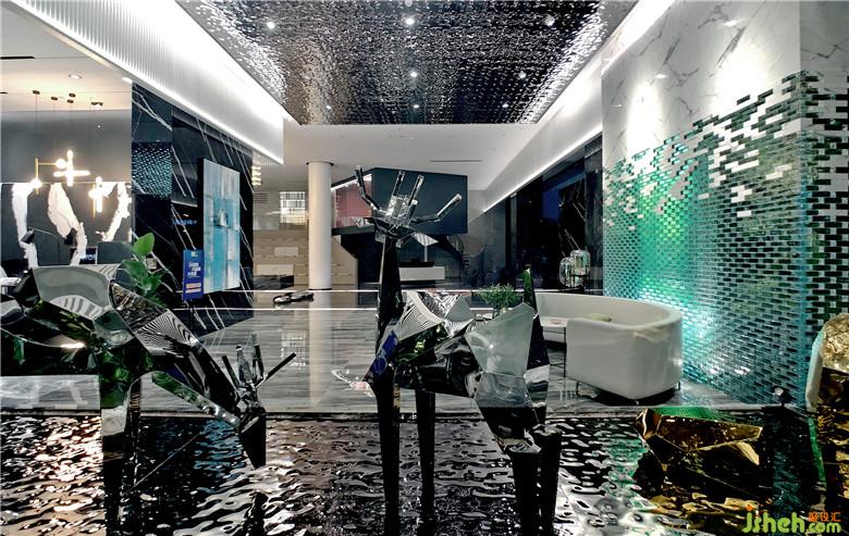 后面放置綠植,下午強(qiáng)烈的陽(yáng)光透過(guò)樹(shù)叢照射在水晶墻上,通過(guò)水晶墻的折射效應(yīng),營(yíng)造出具有奇特夢(mèng)幻般的場(chǎng)景。以光之力,與藝相輔,波光粼粼的不銹鋼天花,其結(jié)構(gòu)的的變化,令光的融合度也產(chǎn)生變化,在日與夜的變化中,通過(guò)微妙的色調(diào)改變著整個(gè)空間的氛圍。