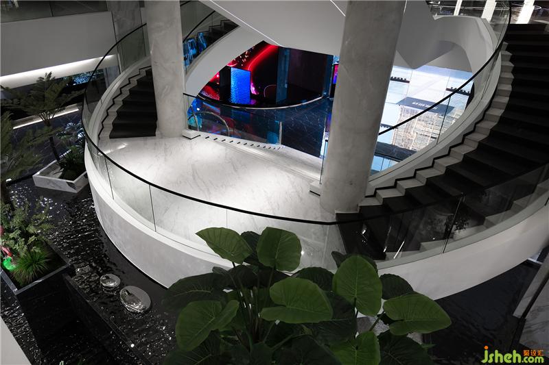 原始建筑結(jié)構(gòu)有諸多不合理的地方,比如龐大而笨重的樓梯堵在入口大堂,將整個空間一分為二,中間一個巨大中空占據(jù)了最主要空間,在主體建筑結(jié)構(gòu)不變的情況下如何通過局部空間改造讓分離的空間串聯(lián)起來,流動起來,使得舊的建筑煥發(fā)新的光彩!總部展廳設(shè)計(jì)