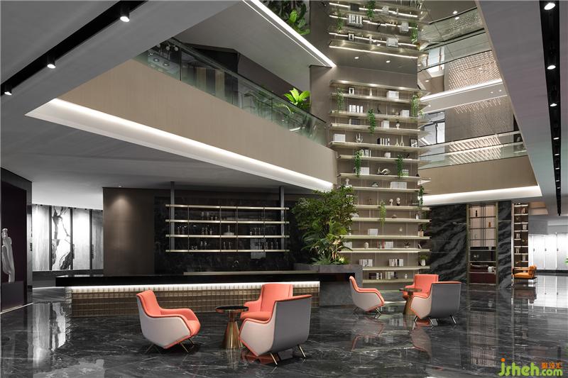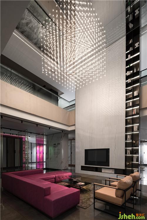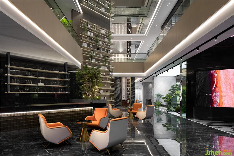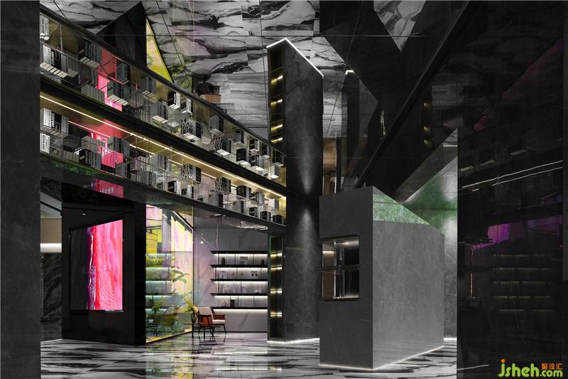 入口休閑區(qū)穿插著多媒體的形式以呈現(xiàn)最佳的展示效果,借助這種方式,讓客戶在虛擬場景空間中慢慢享受科技帶來的全新感受。漫步其中,伴隨輕柔音樂律動(dòng)而產(chǎn)生迷離虛幻的動(dòng)感畫面,虛擬的極光映襯在水面上,在空間中融合科技元素,創(chuàng)造出獨(dú)特的沉浸式場景體驗(yàn),勾引人們對未知世界的探索欲望??偛空箯d設(shè)計(jì)