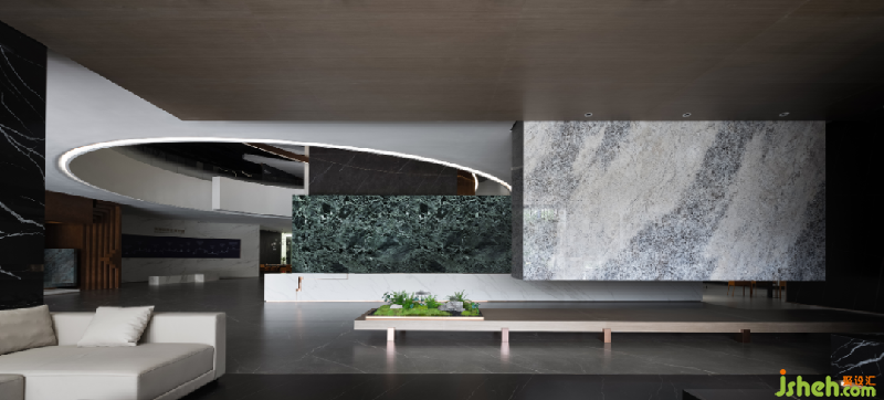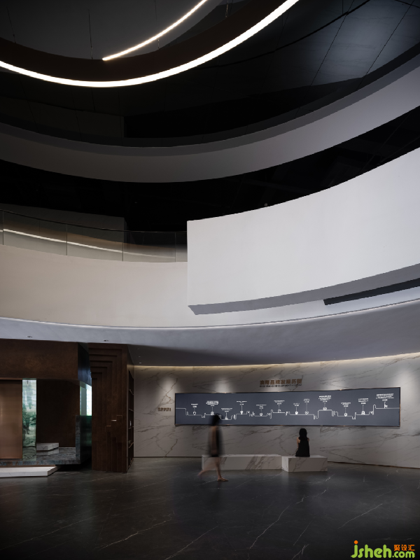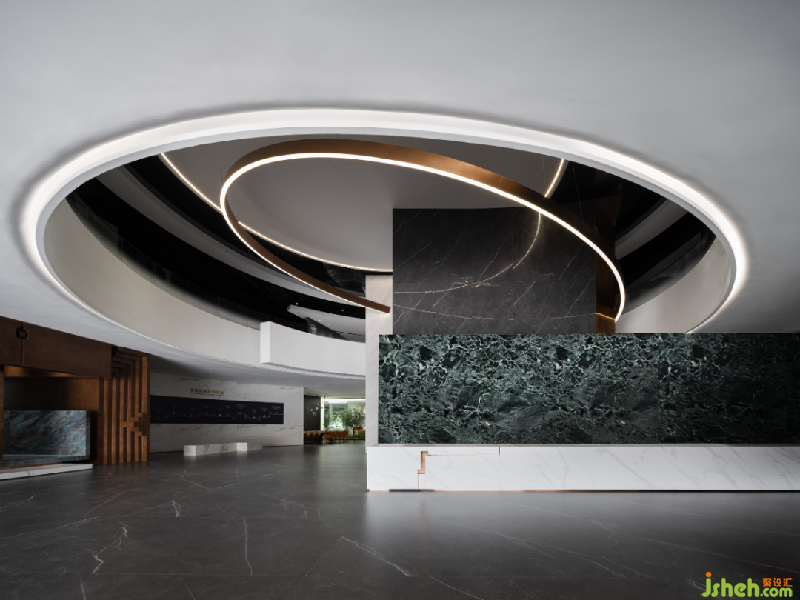 大堂的圓形中空除具有建筑幾何美感,也隱含了東方哲學(xué)觀念的“天圓地方 ”,更表達(dá)出一種星球運(yùn)動(dòng)的軌跡。環(huán)繞線條元素在三維空間里按照美的視覺效果、力學(xué)的原理進(jìn)行編排和組合,營(yíng)造出“別有洞天“的空間感受。