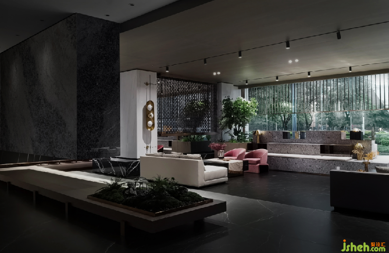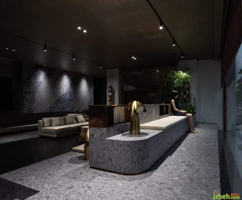 大堂吧通過(guò)松弛有度的地臺(tái)設(shè)計(jì),營(yíng)造一處內(nèi)外有別的休閑場(chǎng)所,向內(nèi)可以輕松暢聊,向外可以欣賞窗外的景致,水磨石質(zhì)感的坐臺(tái)顯出自然生態(tài)感,金屬屏風(fēng)以及臺(tái)燈更增加精致的生活品質(zhì)感,理想與現(xiàn)實(shí)于此碰出最相宜的相處模式。