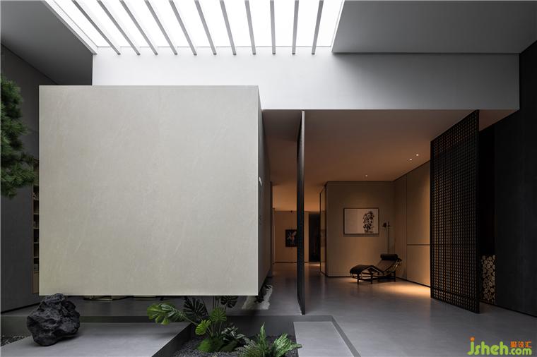“久在樊籠里,復得返自然”。從狹長的通道空間走出來,穿過一個石塊堆疊的洞口,眼前一片開闊。這里被設計成一個戶外庭院,其中有一條素色水泥質(zhì)感的巖板小徑,巖板展廳設計以及庭院中央的茶亭。天光的注入給這個空間帶來了一種別有洞天的感覺,它被賦予了靜謐和詩意。