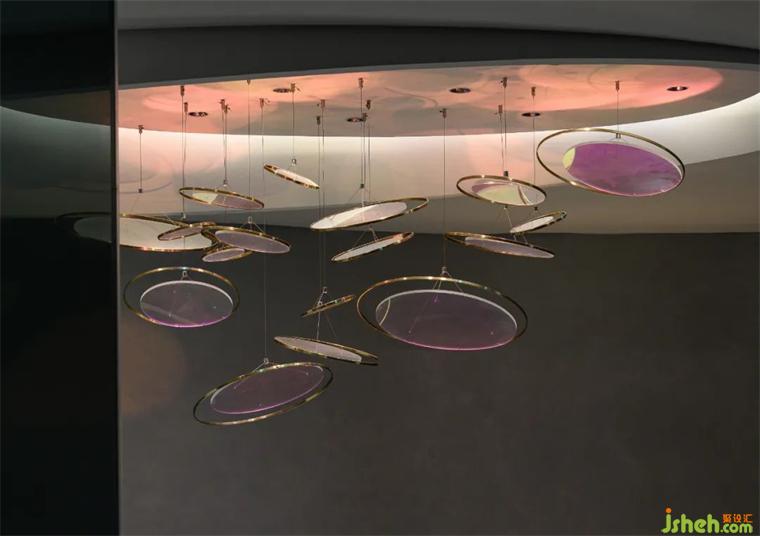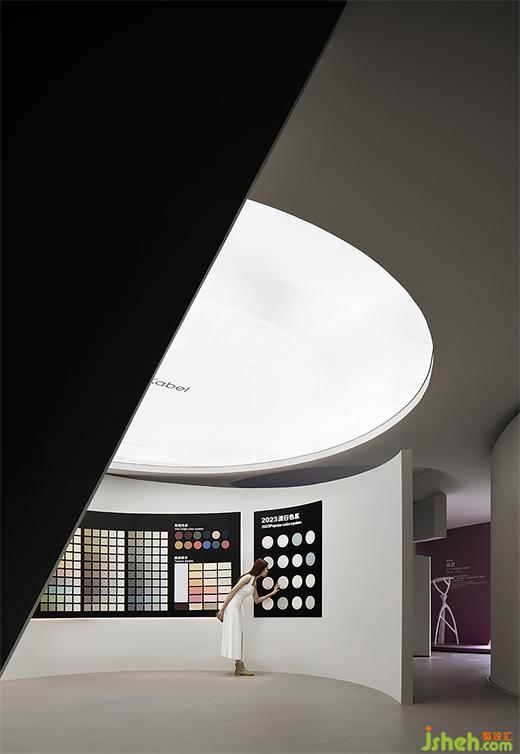 在展廳的大堂領域,一組絢麗的圓形彩色亞克力燈片宛如星辰點綴。燈光如詩,穿越彩色的亞克力燈片,輕輕撫摸過墻面和地面,把空間幻化成夢幻的彩色宇宙。這一巧妙的設計,如同旋律繞梁,不僅在視覺上演奏出動人的音符,更賦予了展廳獨特的靈魂和氣質,進一步詩化了涂料展品的主旋律和特色。