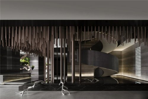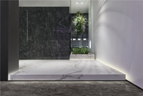項(xiàng)目的設(shè)計(jì)靈感來自一只破繭而生的蝴蝶,它的故事如同一場奇妙的變化,展瓷磚總部設(shè)計(jì)現(xiàn)出品牌的重生與煥新。展廳空間采用了極致簡約的黑白灰調(diào)性,深灰色的水泥質(zhì)感墻面以及白色連紋大理石樓梯加上純白色絲印烤漆玻璃背景墻,單純而寧靜中透出的高貴優(yōu)雅,彰顯品牌對(duì)意式極簡美學(xué)的堅(jiān)持。