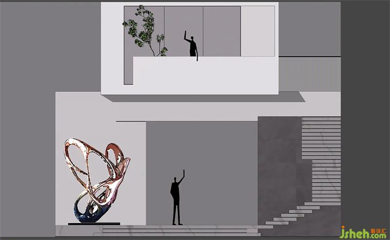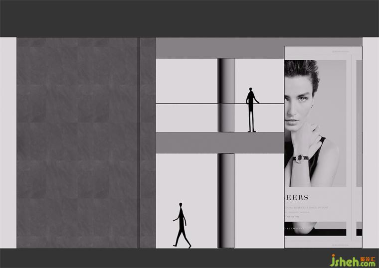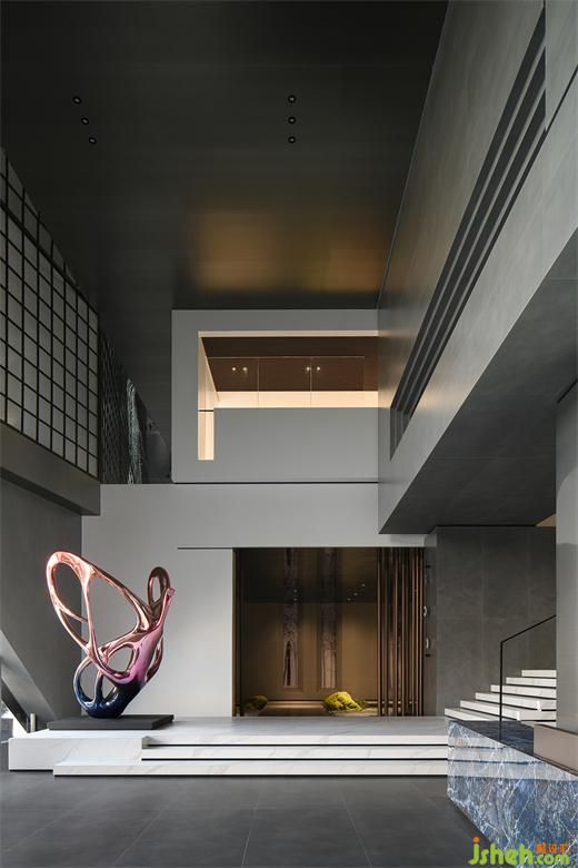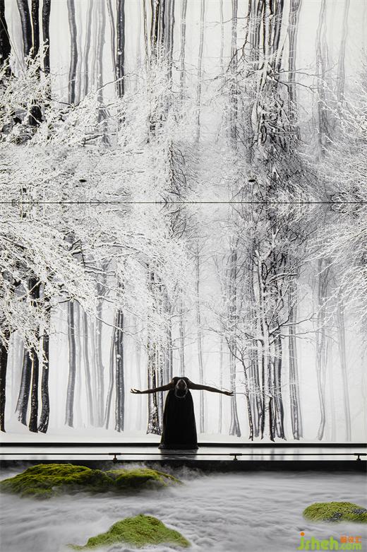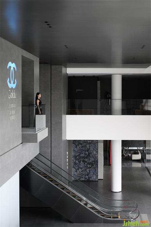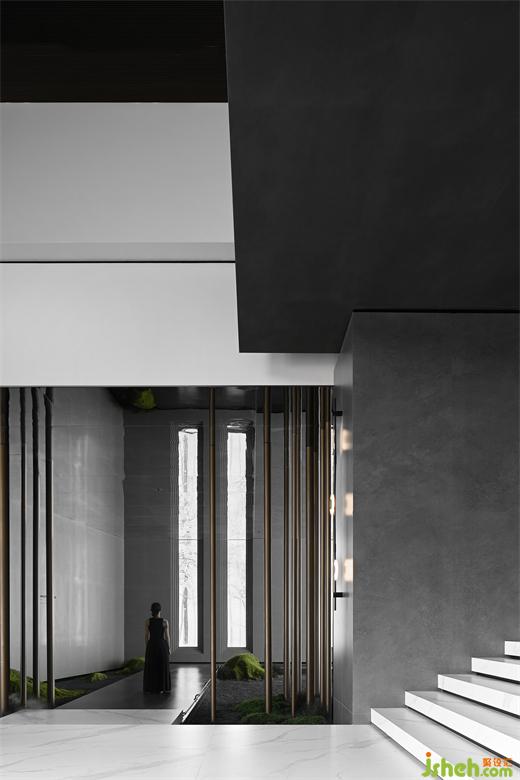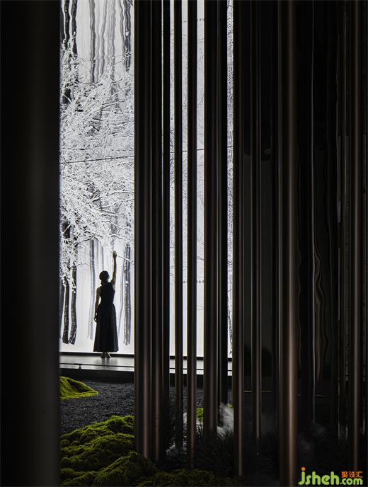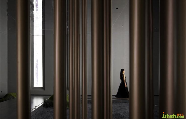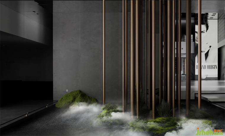 穿過大堂盡頭,恍若進(jìn)入一片森林秘境,無限的延展與放飛想象,讓身心合一,感受心靈與自然親密接觸。瓷磚總部設(shè)計師在這里用虛實(shí)相加的手法營造了一片森林秘境,用粗細(xì)不同的不銹鋼圓柱做成叢林,在叢林中設(shè)置造霧器使云霧彌漫開來,和虛擬的霧凇林相互映襯,穿過叢林的一條U形棧道增加了進(jìn)入該空間的儀式感,