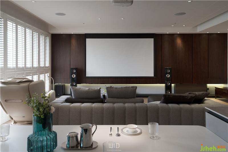 客廳空間始用了投影幕來代替電視機,以隱藏的手法將視聽影音設(shè)備化於無形,當天花板投影布幕自動垂降,客廳瞬間成為高級的家庭劇院,準備好爆米花和啤酒,看球賽、聽音樂或選部想看很久的電影,慵懶的躺在沙發(fā)上,那將會是一件多么享受的事!在家也能擁有專業(yè)、舒適的視聽環(huán)境。
