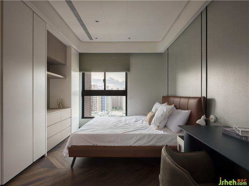 人字拼接不同顏色的深淺,增加了空間的動(dòng)感,另外各種家具天花和曲線的結(jié)合,也寓有著別樣的氣質(zhì)。不規(guī)則曲線的半腰床頭板墻,將睡眠區(qū)與閱讀區(qū)分隔出來(lái),引窗外天光至此,善利用轉(zhuǎn)角處創(chuàng)造床頭光。以圓曲線造型規(guī)劃出衣柜,曲直互補(bǔ)增加了臥室柔和,空間流動(dòng)互相呼應(yīng)。