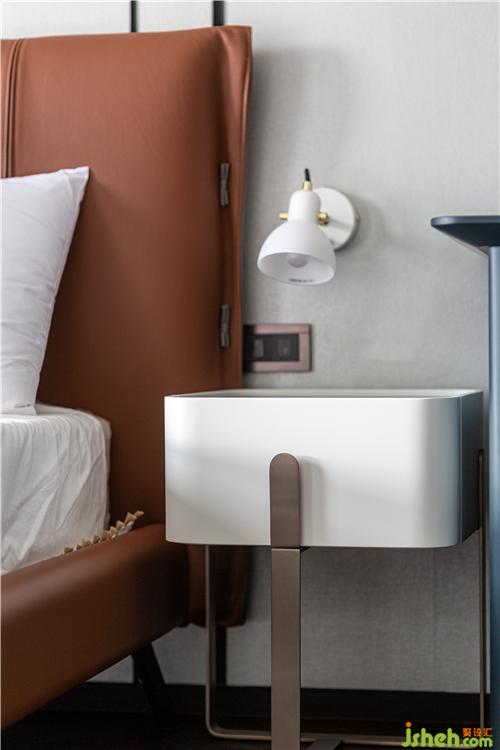 馬鞍皮與車(chē)縫線演繹著雋永的訂制感,平添一種奢華簡(jiǎn)約,處處顯露著材質(zhì)混搭的精工。每一個(gè)縫線和皮料都經(jīng)過(guò)時(shí)光的工法有所呈現(xiàn),有柔有剛的壓條與皮革優(yōu)雅體現(xiàn)在細(xì)致的線條與細(xì)節(jié)上。臥室空間,床頭柜墻的另一側(cè)被設(shè)計(jì)為為書(shū)房空間,讓其具有足夠的開(kāi)放性,即能滿足閱讀功能。融合了展示格、書(shū)籍收納層架以及抽屜,并加入亮橘點(diǎn)綴,營(yíng)造視覺(jué)的驚喜和動(dòng)感。