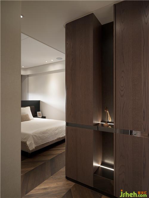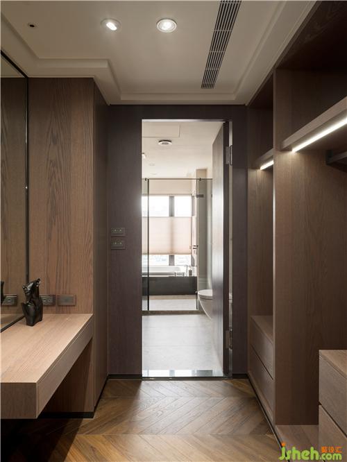 次臥更衣室延續(xù)木質(zhì)溫潤(rùn)基調(diào),打造機(jī)能十足的空間,區(qū)隔衛(wèi)浴又具有穿透感。借以延伸、穿透、借景和復(fù)合。
