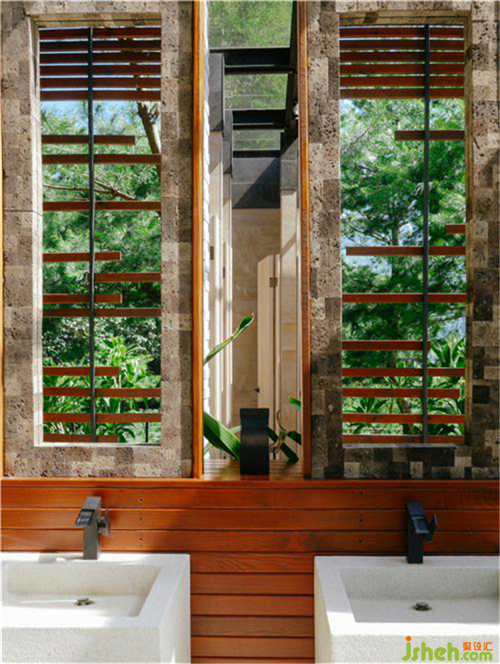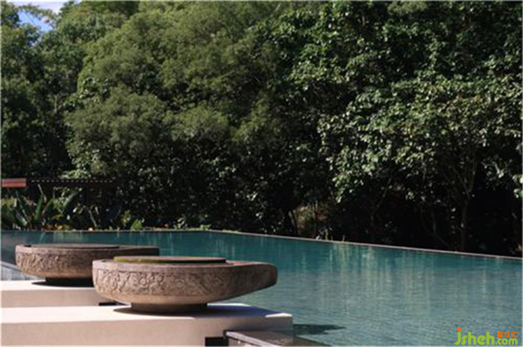泳池酒吧結合島國傳統(tǒng)涼亭特色,運用的木材、石塊和藤條散發(fā)出大自然氣息,簍空木頭疏密有致、錯落有序 ,消融了室外與自然的隔閡 。藤制椅打造輕盈熱帶氣息舒適且通風,利用玻璃天花打造了溫和的陽光,坐在那里,可以無邊際泳池為背景,將郁蔥蔥的林地美景一覽無遺。