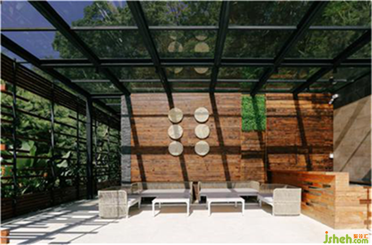 ?泳池酒吧設計大氣通透,空木頭疏密有致、錯落有序