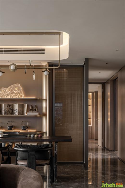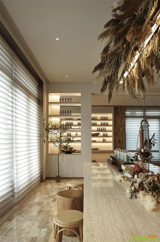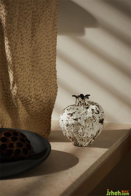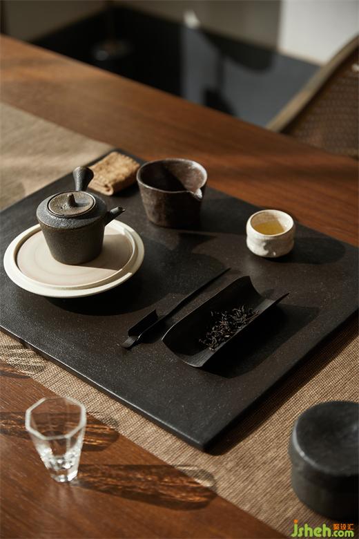 精致的器皿里蘊(yùn)含著使用者在生活中所追求的儀式感,在入口軟裝的選型上,融入了一些自然意向,結(jié)合矮凳和條桌的選型,放大了空間的禪意氛圍,并增加了人們?cè)诖颂幇l(fā)生交流的可能性。