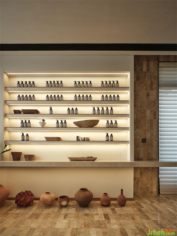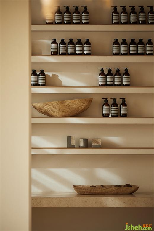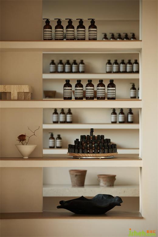 The Spa area and guest rooms use a darker colour palette and light and shadow effects to provide a comfortable place for guests to rest and recuperate.The design of the aromatic showcase attempts to convey a sense of escapism, holiday, garden and relaxation to the outside world.