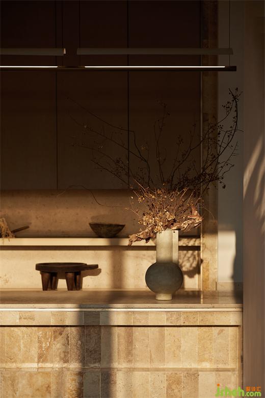 而芳香體驗(yàn)區(qū)域,增加了洞石的材質(zhì),與木質(zhì)的碰撞,為空間帶來(lái)一絲沉靜安逸的氛圍。