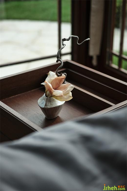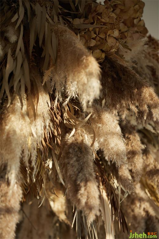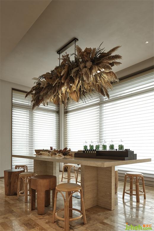 多種木質(zhì)的混合,結(jié)合在室內(nèi)裝置上添加的頂棚吊花,也強(qiáng)調(diào)了整體空間的草木質(zhì)感。藍(lán)城花海芳香小鎮(zhèn)會(huì)所設(shè)計(jì)家具選型又以手工藝術(shù)風(fēng)格制品為主,強(qiáng)化了這種的氛圍感受。