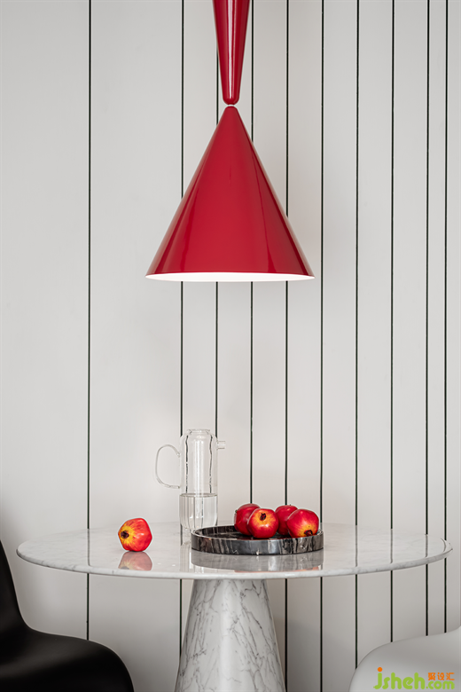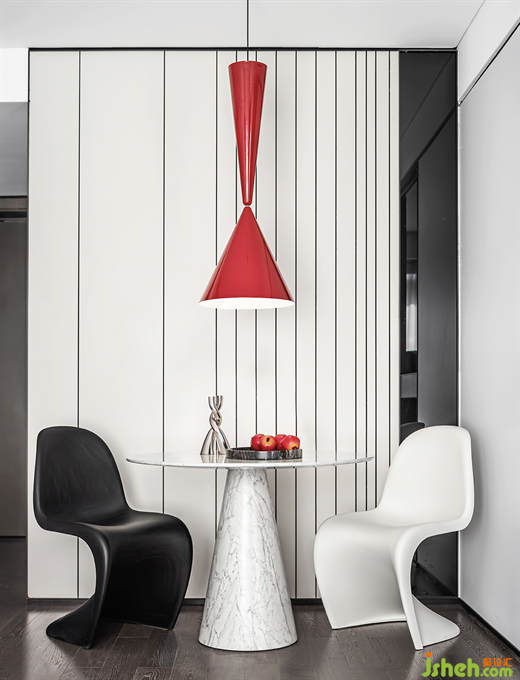 開放式的用餐區(qū)適合一人的簡約生活,紅與黑的經(jīng)典撞色, 搭配紅色錐形的吊燈,打造一場屬于自己的美食盛宴。