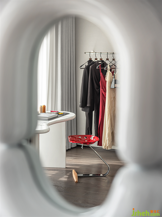 直播工作間設(shè)置了透明的玻璃推拉門,視覺上更加通透,形成延伸感,模糊了兩個(gè)區(qū)域的界限,更為自由與流暢。作為新時(shí)代的獨(dú)立女性,事業(yè)是人生不可或缺的部分,如何呈現(xiàn)創(chuàng)意與美感,來自設(shè)計(jì)師對于氛圍的出其不意的創(chuàng)造,深圳樣板房設(shè)計(jì)從而煥新了職業(yè)女性居家辦公的高效性與儀式感。