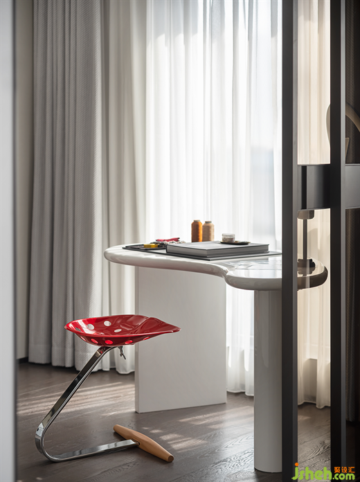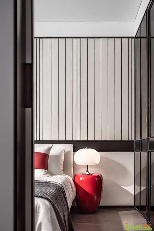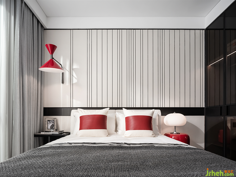 臥室是心靈與身體的庇護(hù)所與能量場,以大面積的經(jīng)典黑白為基底,對比強(qiáng)烈,墻面線條利落有序,不規(guī)則的間隔更顯個(gè)性與時(shí)尚,局部點(diǎn)綴紅色造型燈具和曼妙弧度小圓桌,既不沉悶,又延續(xù)了空間的整體主題與調(diào)性。