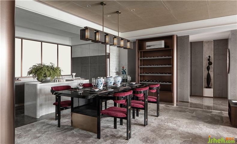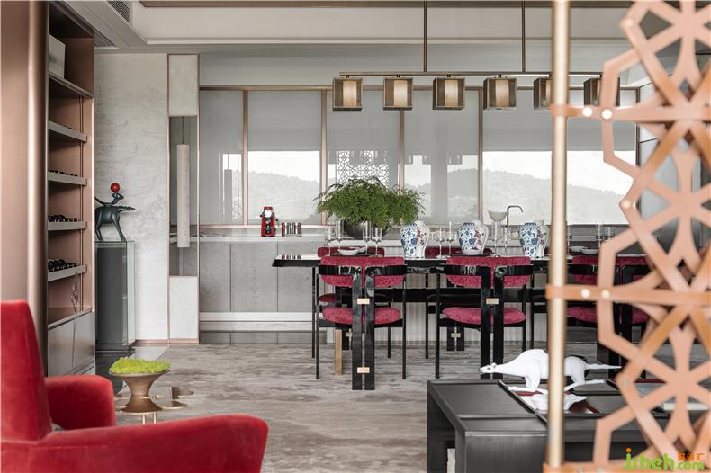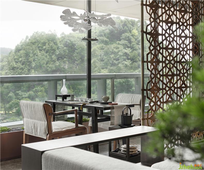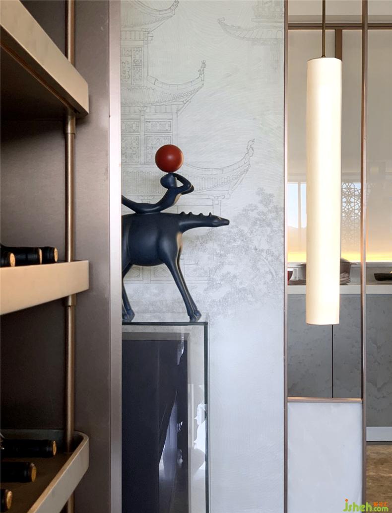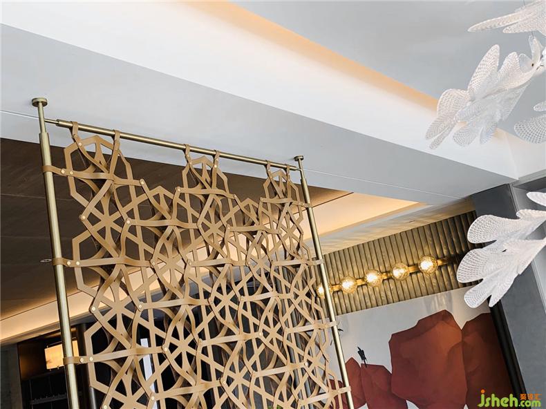 在客廳與陽臺開放相連處,有一扇藝術(shù)屏風(fēng),樣板房設(shè)計其靈感來自貴州當(dāng)?shù)氐娜胫窬?。但設(shè)計師把筆鋒一轉(zhuǎn),利用皮質(zhì)材料構(gòu)筑出這扇兼具藝術(shù)與時尚語匯的編織屏風(fēng),通過不同的材質(zhì)回應(yīng)了城市的地域特色。