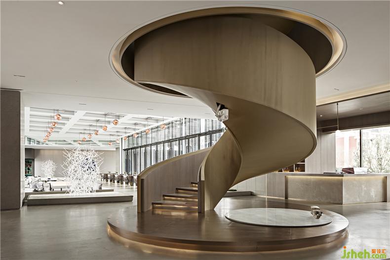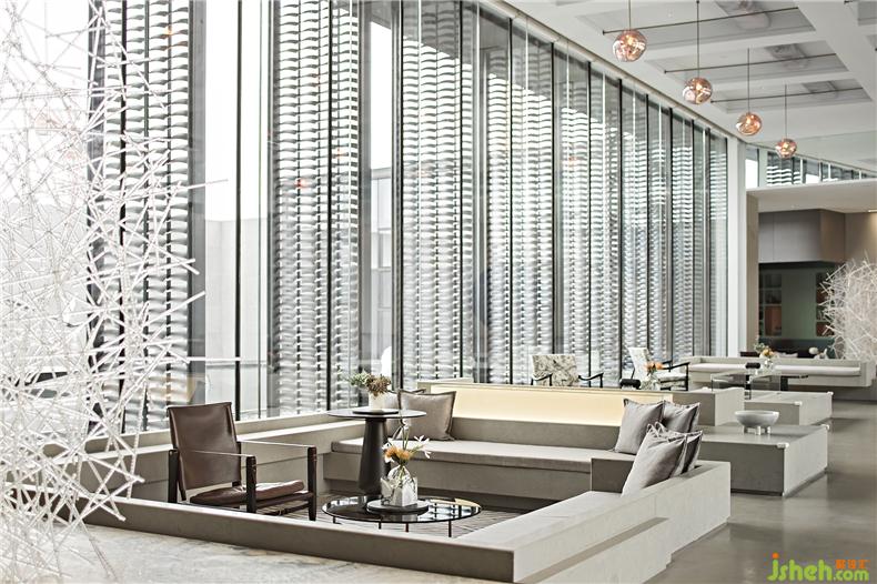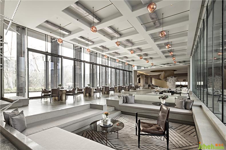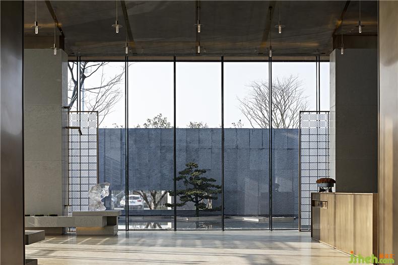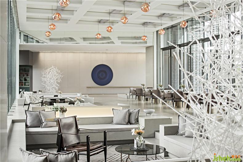 金屬、琉璃、石材巧妙組合運用,勾畫出晶瑩剔透的意境。自然光線傾灑入室內(nèi),玻璃等通透的材料能與光線產(chǎn)生美妙的交互,明暗交錯如水面漣漪反射的光影斑駁。大廳的設(shè)計過濾了來自于外界的繁復(fù),而液態(tài)的樹脂則凝固成想要的形狀,零星點綴在空間中。每一隅角落安置的藝術(shù)擺件都充滿巧妙的用意,空間立刻充盈無形的柔軟的力量,穿梭其中的訪客仿若能傾聽到潺潺水聲。室內(nèi)設(shè)計師