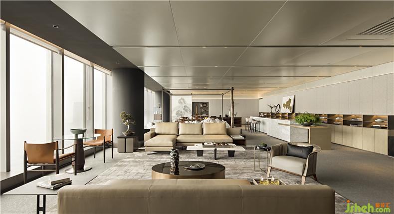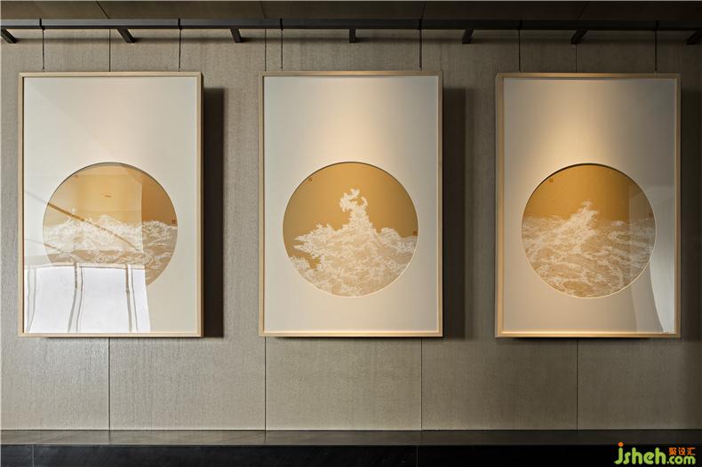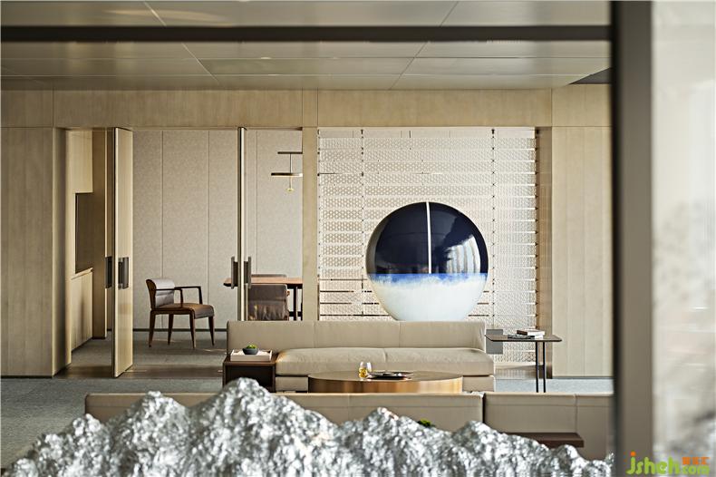 平面格局上劃分了接待、洽談、茶室、水吧、會(huì)議室、會(huì)所設(shè)計(jì)休息室等功能區(qū)域,滿足不同的體驗(yàn)需求,每一個(gè)空間都充斥東方禪境的清凈與陶然。進(jìn)入接待空間,內(nèi)部剔除復(fù)雜裝飾回歸淳樸,以自然肌理為主色調(diào),點(diǎn)綴著藤編藝術(shù)品,營(yíng)造出安穩(wěn)放松的氛圍;洽談區(qū)域一面是開闊的都市叢林景色,一面是返璞歸真的自然禪境。會(huì)所設(shè)計(jì)透過窗可欣賞到天然景色,開闊的視野恰如其分輝映著主人的胸懷與格局;室內(nèi)樸實(shí)雅致的氛圍,又展現(xiàn)出怡然自得:原木與硯臺(tái)石構(gòu)造了室內(nèi)茶亭。會(huì)所設(shè)計(jì)自然肌理石材砌造的吧臺(tái)搭配純色家具;亮銀色山巒雕塑、水墨藝術(shù)裝置、山水屏風(fēng),以及青松盆景的點(diǎn)綴,既似烏托邦的隱喻,又如現(xiàn)代化的鏡像,使整個(gè)空間在極簡(jiǎn)的古韻中,滲透幾許現(xiàn)代品味?;蛲A?、或游走、或靜坐,在毫無刻意手法營(yíng)造的室內(nèi)空間,處處感知高山流水之雅意。