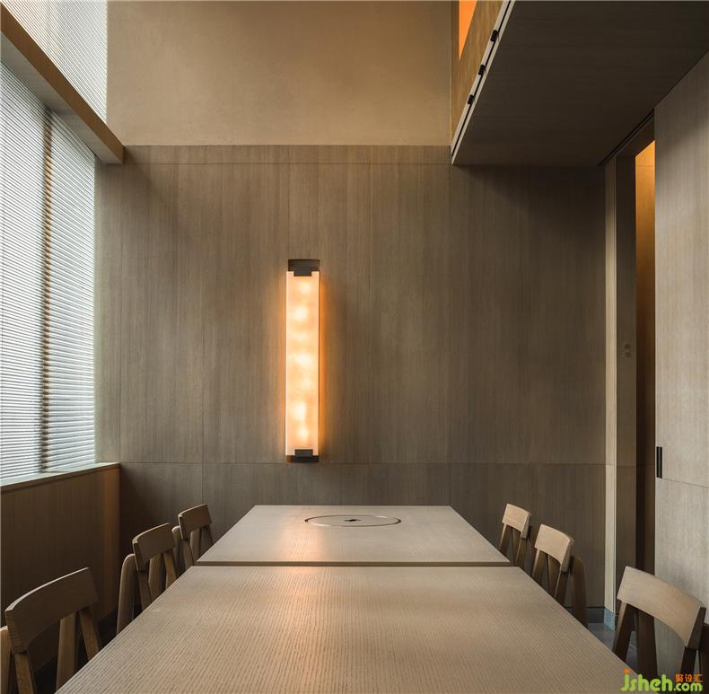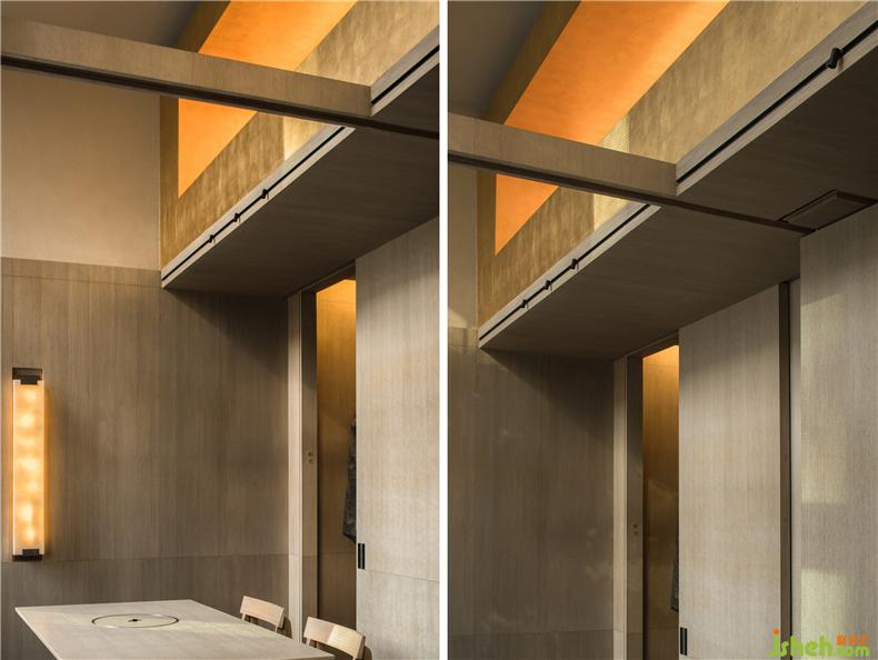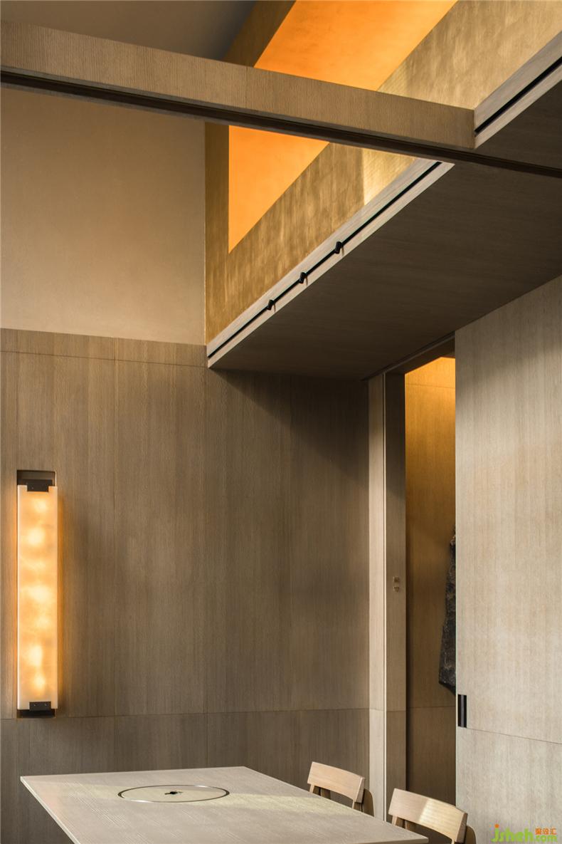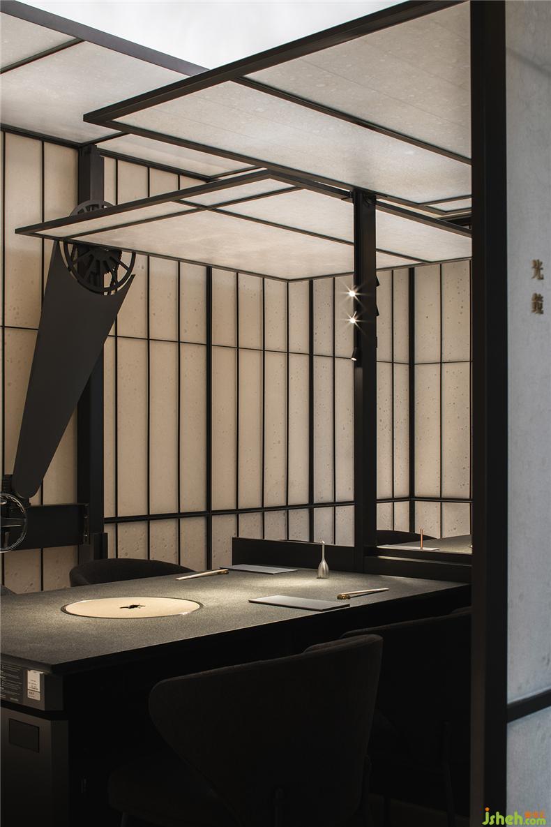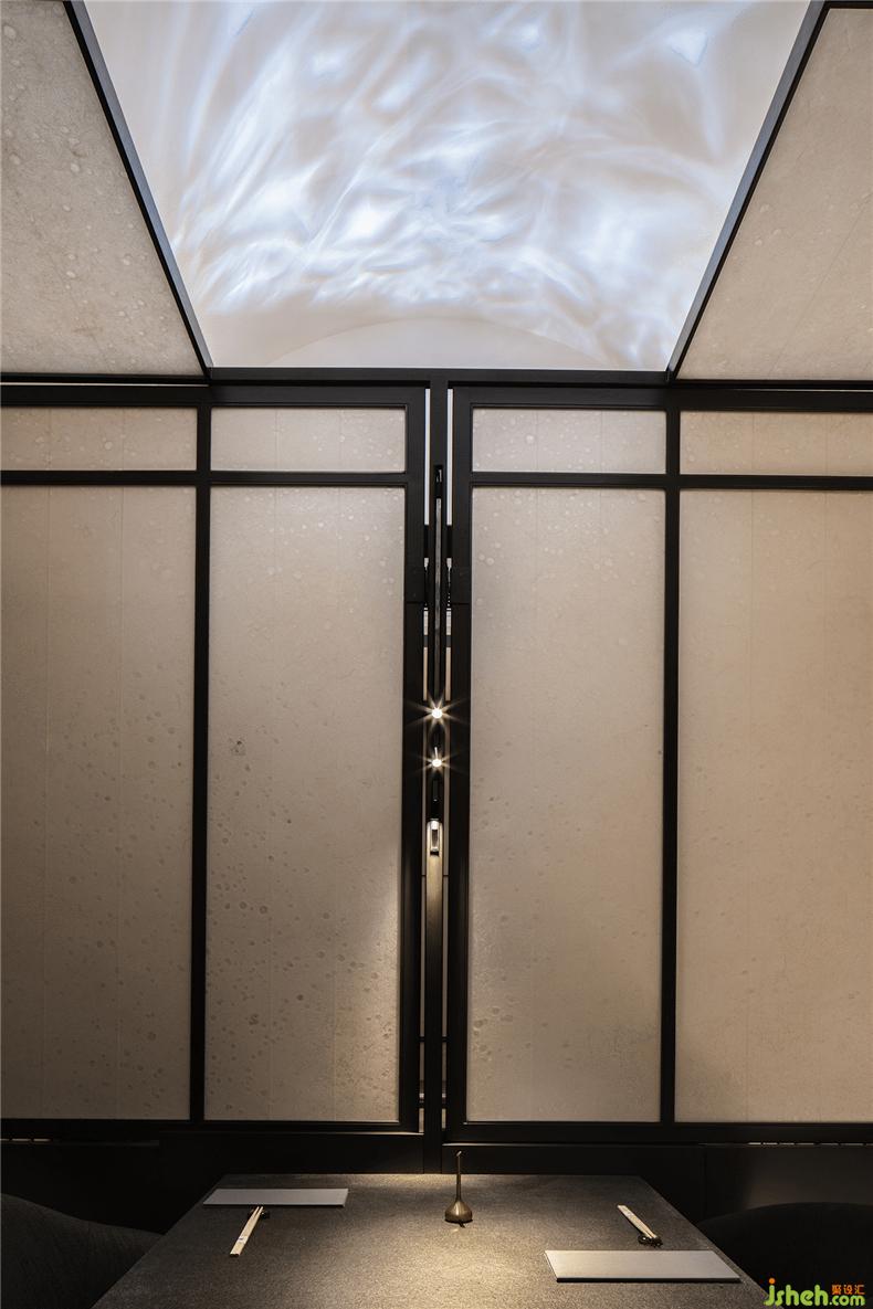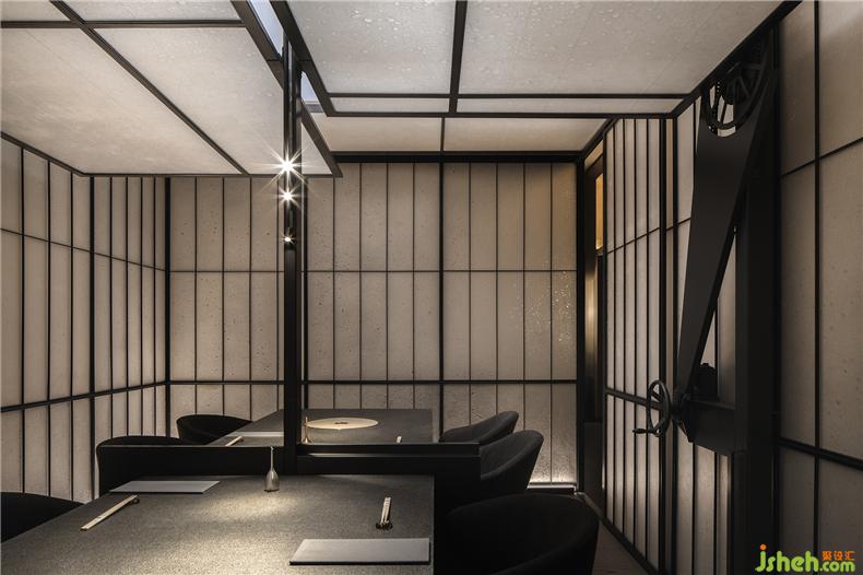 不同的空間以不同的材料進行裝飾,金箔,金屬烤漆,織物,木紋,餐廳設(shè)計營造出不同的氛圍。包房開合自如,包房開合自由宛如京都的沿街小店,結(jié)合可升降的天花背景,模擬天空,引入自然元素,讓空間有動態(tài)的美感。