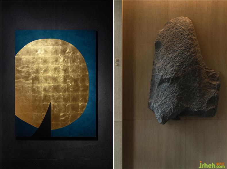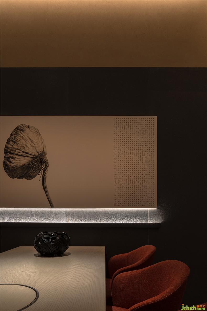 不規(guī)則的原石形態(tài),以敦實(shí)厚重的體積和自然的紋理,為空間注入深刻的能量。餐廳設(shè)計(jì)一抹東方水墨擬景,此前紅塵蒼茫,歸來(lái)洗盡鉛華。