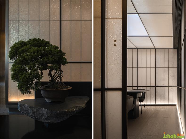 吧臺(tái)邊上,一塊厚實(shí)巖塊砌成拖臺(tái),簡(jiǎn)潔而有力度,茂盛的松樹(shù)盆景置于其上,為整個(gè)深沉的空間添加一抹綠意趣味。