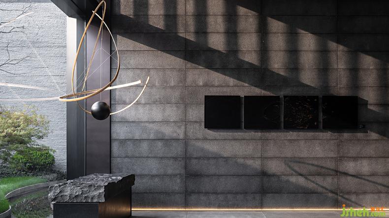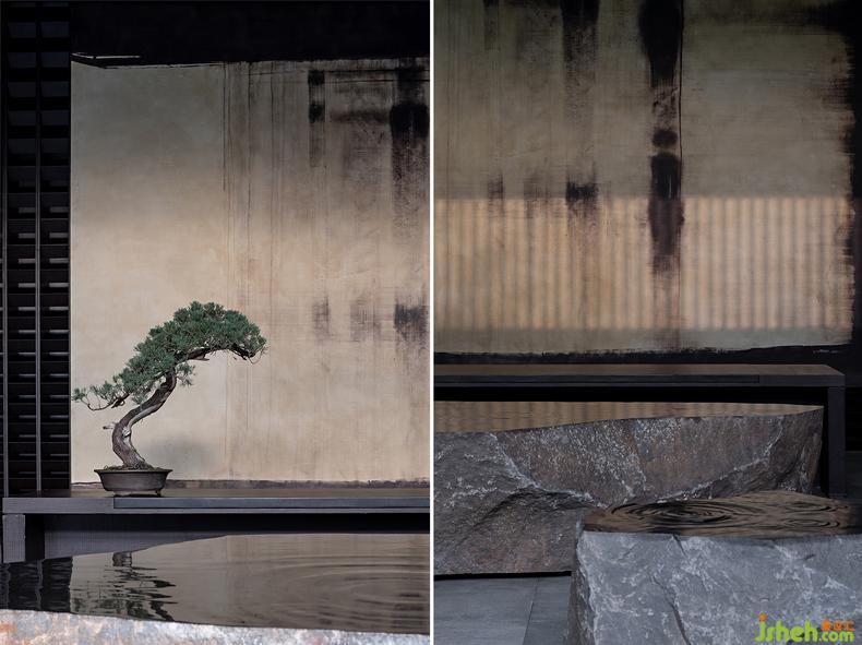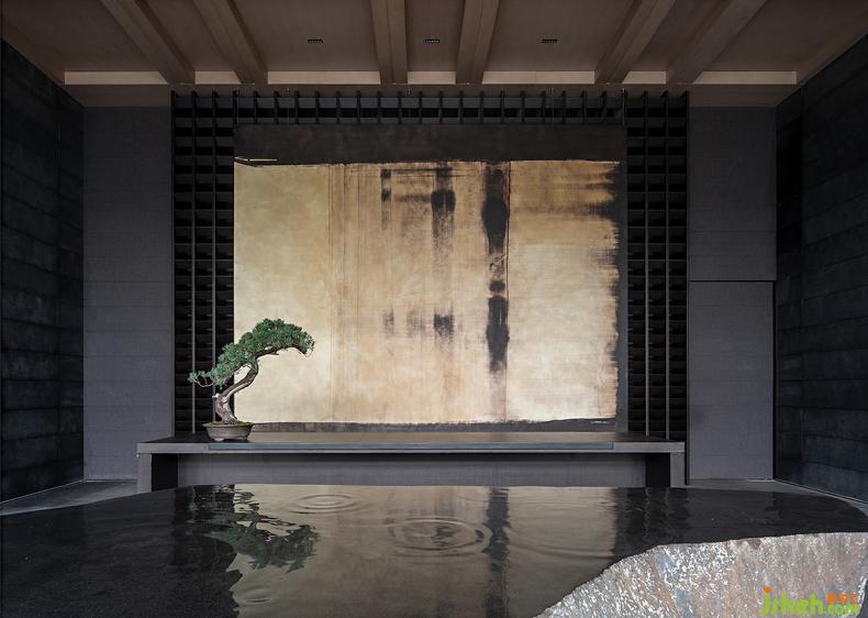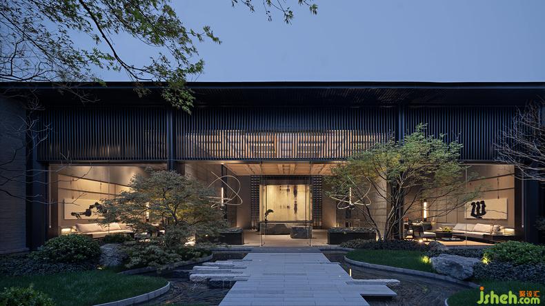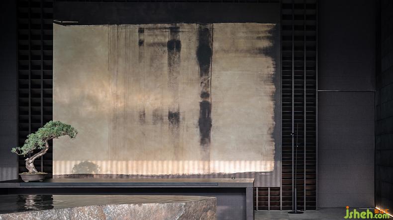 在這般滴翠的綠意中,掩映著一座與庭院共生的“閣子”,由深灰色格柵圍構(gòu)起的建筑去掉一切多余,被抽象為最簡(jiǎn)凈的線條和空間,摒棄矯飾反得一種純粹的哲思,這樣的空間精神也讓人自然生出返觀內(nèi)省的安靜。因?yàn)樾撵o下來,感知與思考也被無限放大,于是使用透光障子的天花將自然光引化為“光陰的故事”——古人說時(shí)間是光陰,這其中已然含有明暗交替的空間感。會(huì)所設(shè)計(jì)再加上庭院里通過格柵透入的自然光,這個(gè)空間竟然又將時(shí)間凝固了。身在其中,不論是靜立或徜徉,都如在閱讀歷史的詩(shī),觸摸當(dāng)代的云,浴沐湖面的風(fēng),是五感交織的神游。