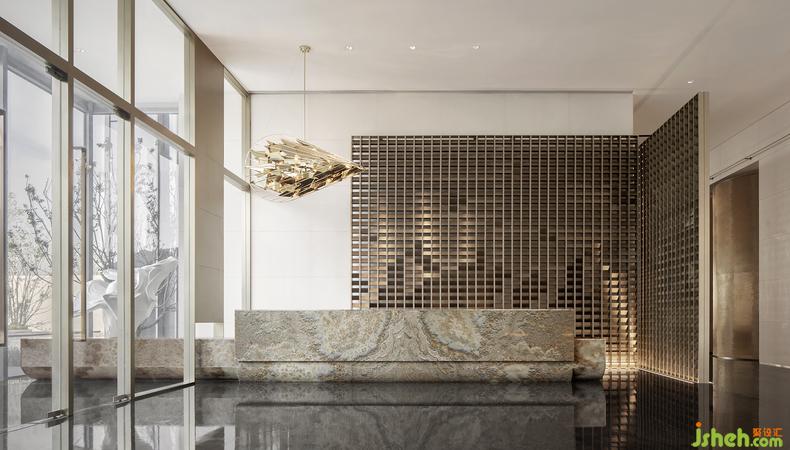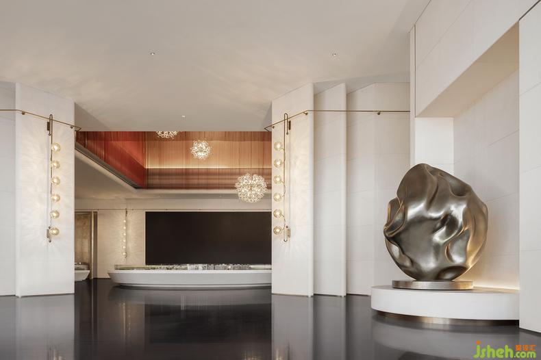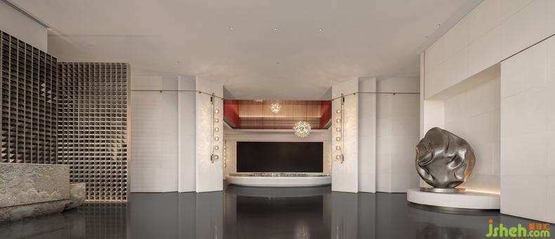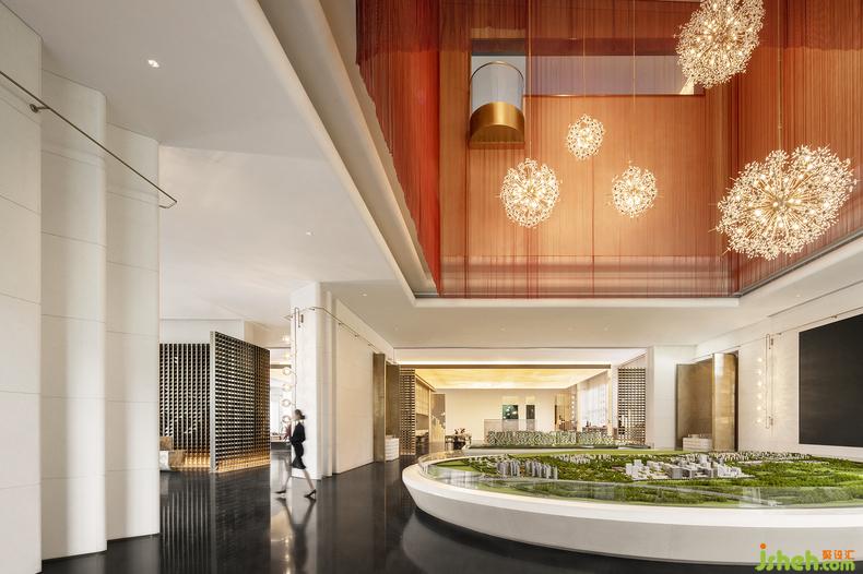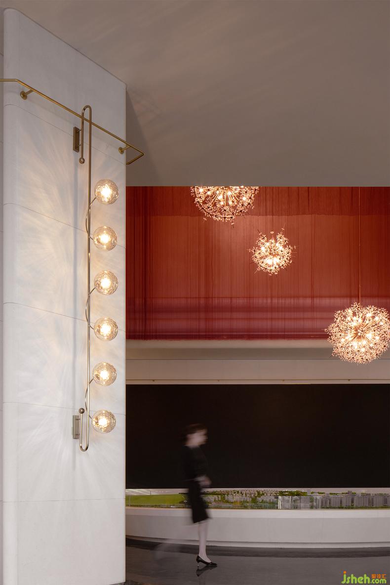 移步往前,由紅色金屬簾幕圍墜起的沙盤區(qū)域恰似長河落日籠罩的幽谷,生活館設計展示著專屬這片土地的壯麗。金屬簾幕從天花墜下,其材質透光特性帶來的通透感讓人在其中更感靈動,而紅色主題又蕩漾出一種少女舞姬那翩躚紅裙與曖昧面紗的風情萬種。簾幕中還間雜著幾盞煙花般綻放的吊燈,讓人如見落日、如遇星光,胸中更生無限瑰麗的遐想。