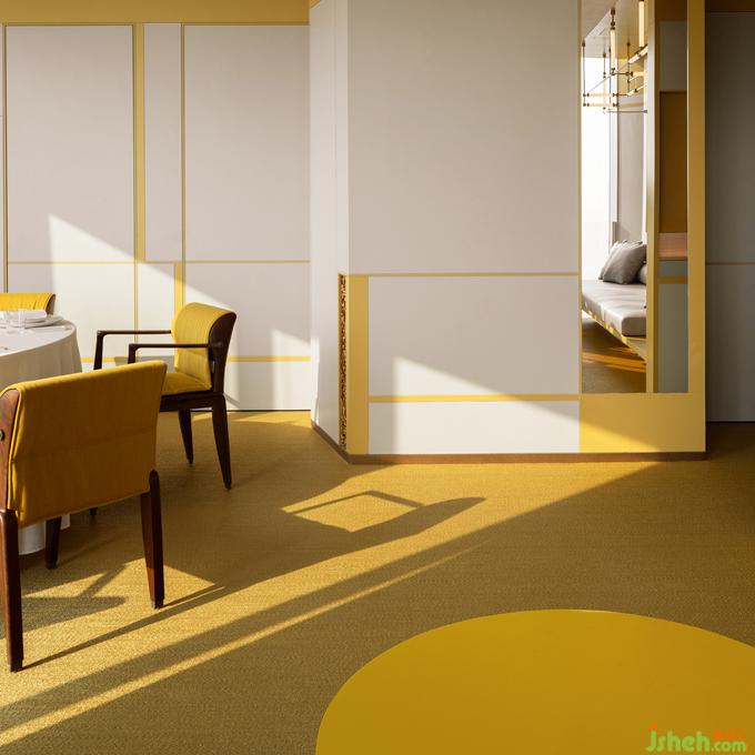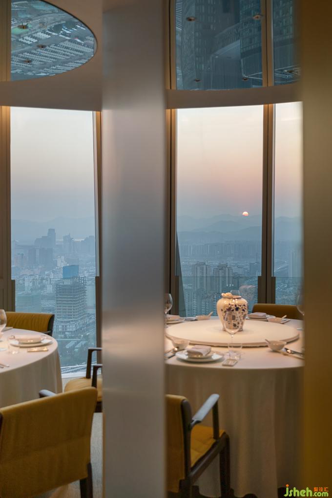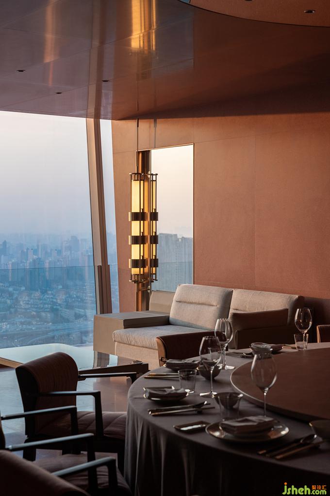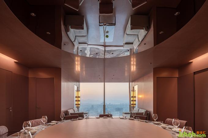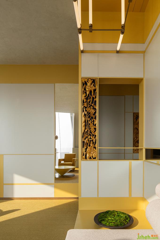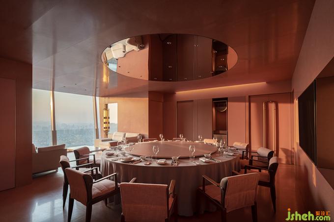 延續(xù)赤中帶黃的西窗余暉意象,與“黃”相鄰的空間提取茶湯的色澤并調(diào)和為低飽和的粉系,融會(huì)在介于真實(shí)呈現(xiàn)與詩(shī)意渲染之間的折中主義環(huán)境中,最大限度兼納多元化的客群偏好。餐廳設(shè)計(jì)招式簡(jiǎn)凈的界面體塊穿插錯(cuò)位剪裁的嵌入式背景墻,在縱深層次的結(jié)構(gòu)中塑造無(wú)限度的沉潛空間。而以色彩為線(xiàn)索并置串聯(lián)的包間體系,皆納入景觀(guān)與天光作為空間參照,以一種相互包容滲透的關(guān)聯(lián)組合回應(yīng)這座城市開(kāi)放復(fù)合的性格